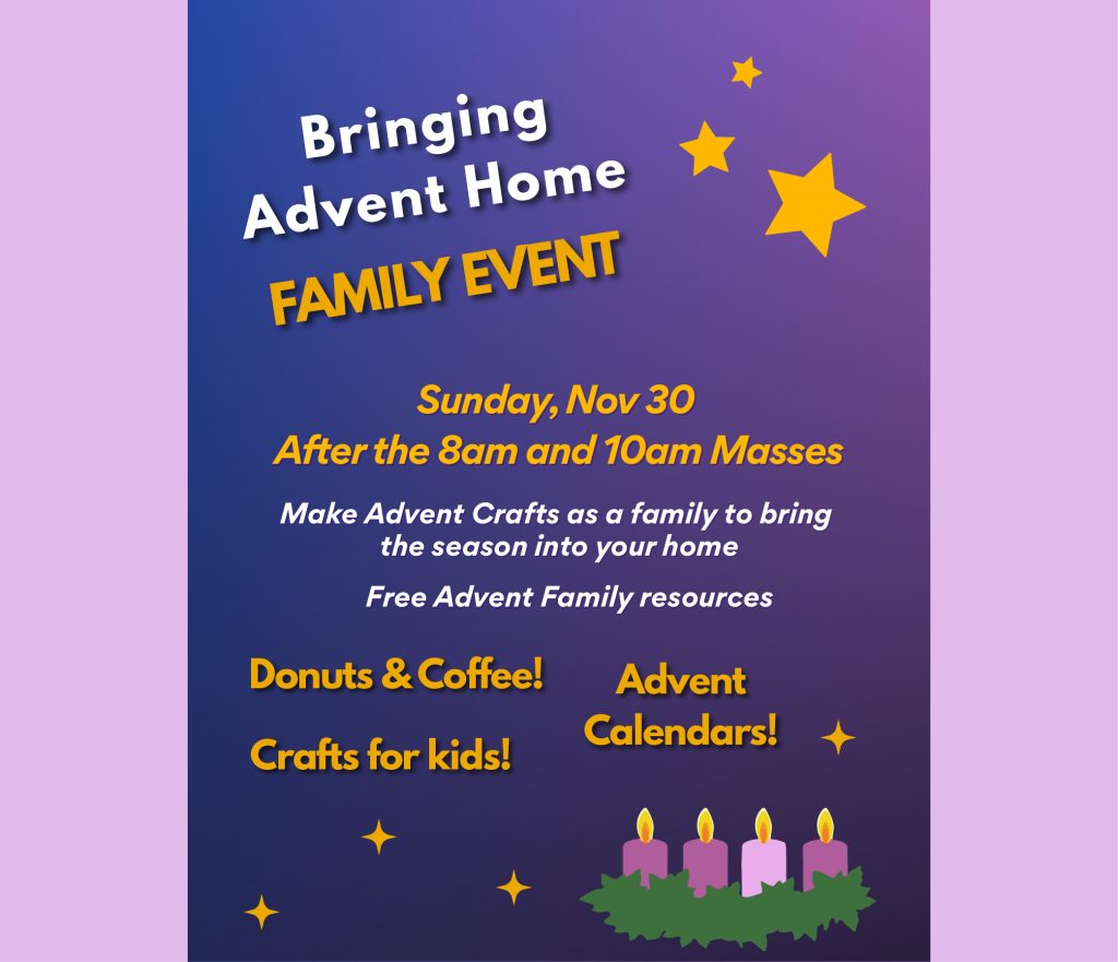 Join us for some fun crafts to get your home ready for the Advent season! We’ll also have coffee and donuts, Advent calendars, and other free family resources to make Advent special.