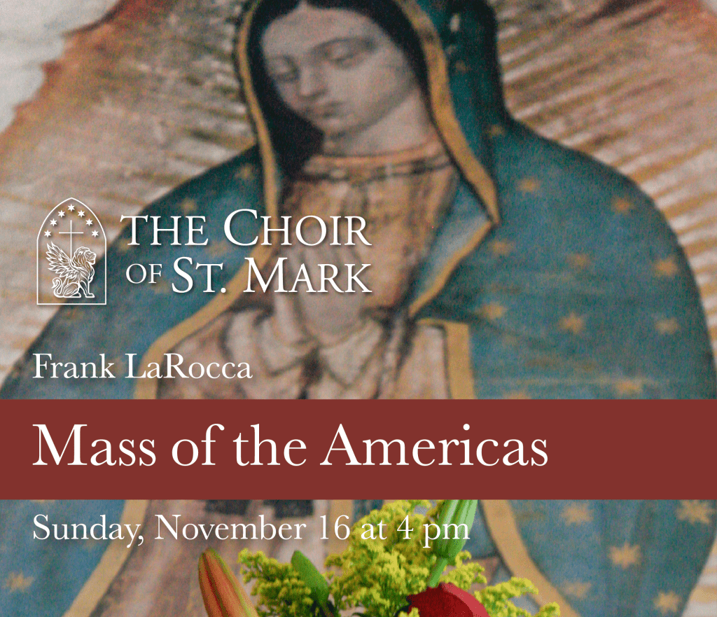 On Sunday, Nov. 16 at 4 pm, the Choir of St. Mark will present “Mass of the Americas” by contemporary Catholic composer Frank LaRocca. A reception will follow. Watch a brief into to this beautiful composition below: