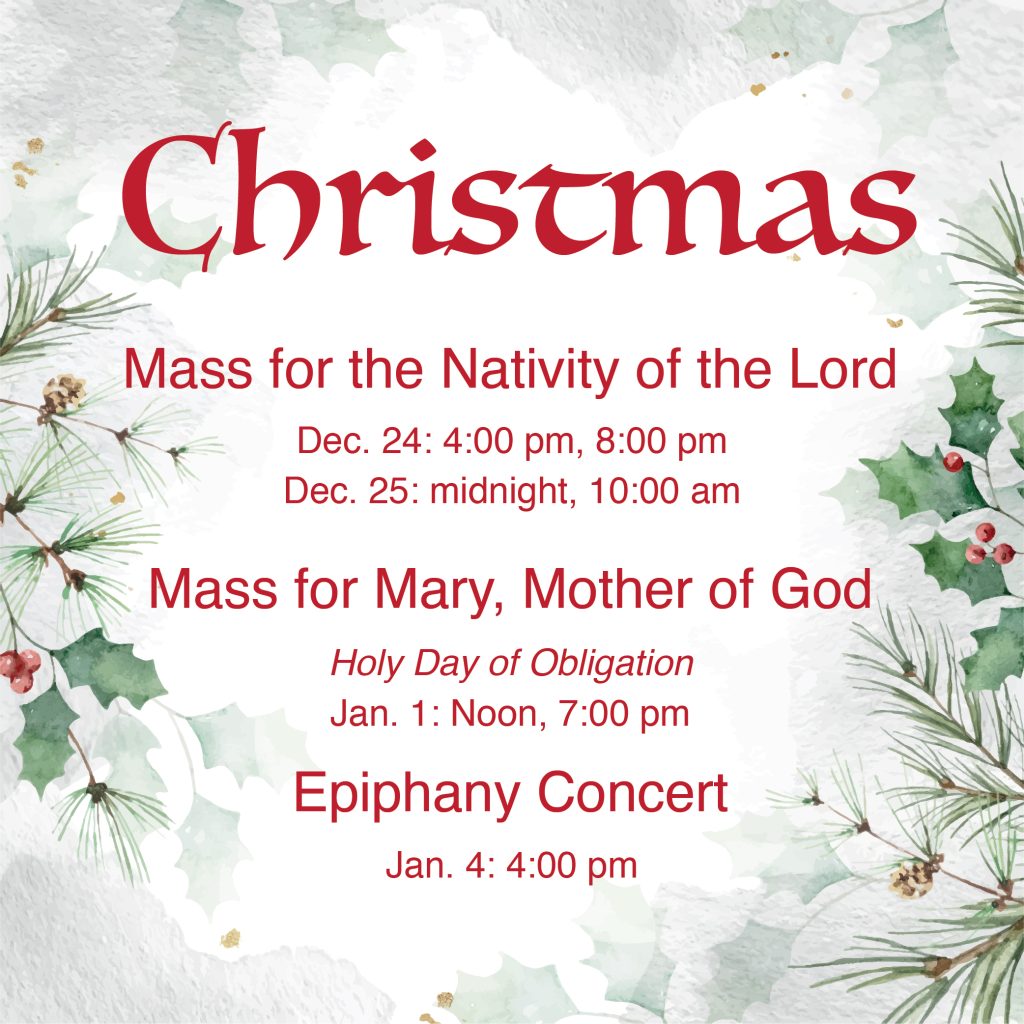 The Solemnity of Mary, Mother of God is Thursday, Jan. 1 and is a holy day of obligation. Mass times are noon and 7 pm.